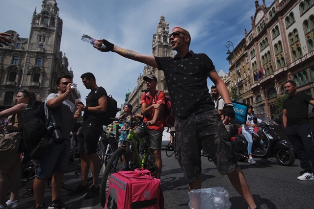 A Margit hídnál egy nő éppen azt magyarázza a rendőröknek a hidat még mindig lezáró tüntetőkről beszélve: