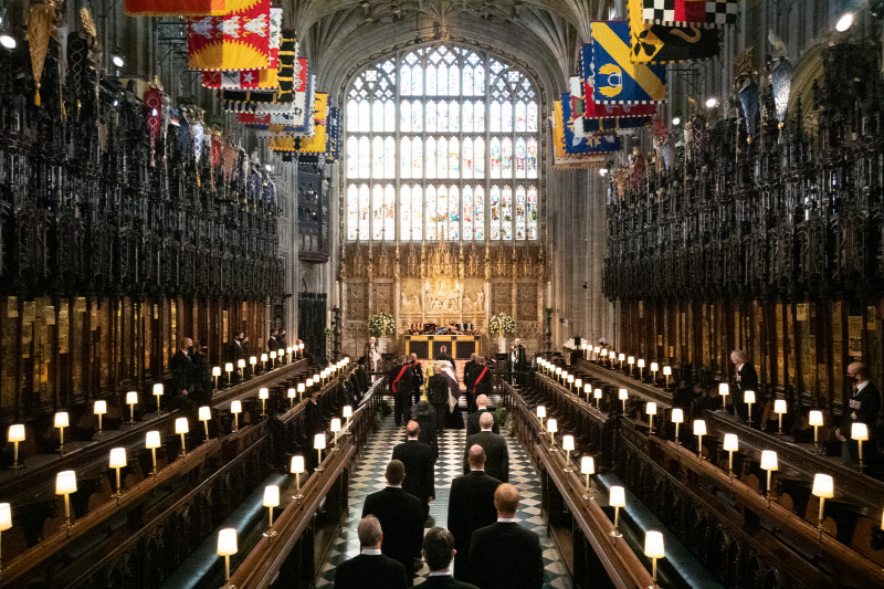 A menet hamarosan megérkezett a kápolnához, ahol egyperces országos néma csenddel emlékeztek meg a hercegről, majd a koporsóját bevitték a kápolnába, ahová már csak a harminc meghívott vendég kísérhette el, a többieknek kint kellett maradniuk.