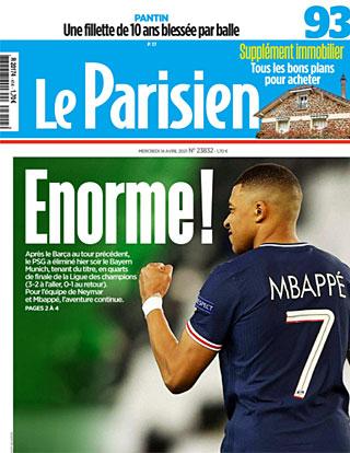 A Párizs szélesre tárta a koronázás felé vezető út kapuját – állapítja meg ünnepélyesen internetes kiadásában a Le Parisien, amelynek szerdai nyomtatott példányának címlapjára Kylian Mbappé került. „Óriási!” – hirdeti az első oldal, hangsúlyozva, hogy a címvédő Bayern München előtt egy másik topcsapatot (FC Barcelona) búcsúztatott a francia bajnok. Neymar és Mbappé csapata folytatja a kalandot – teszik hozzá.