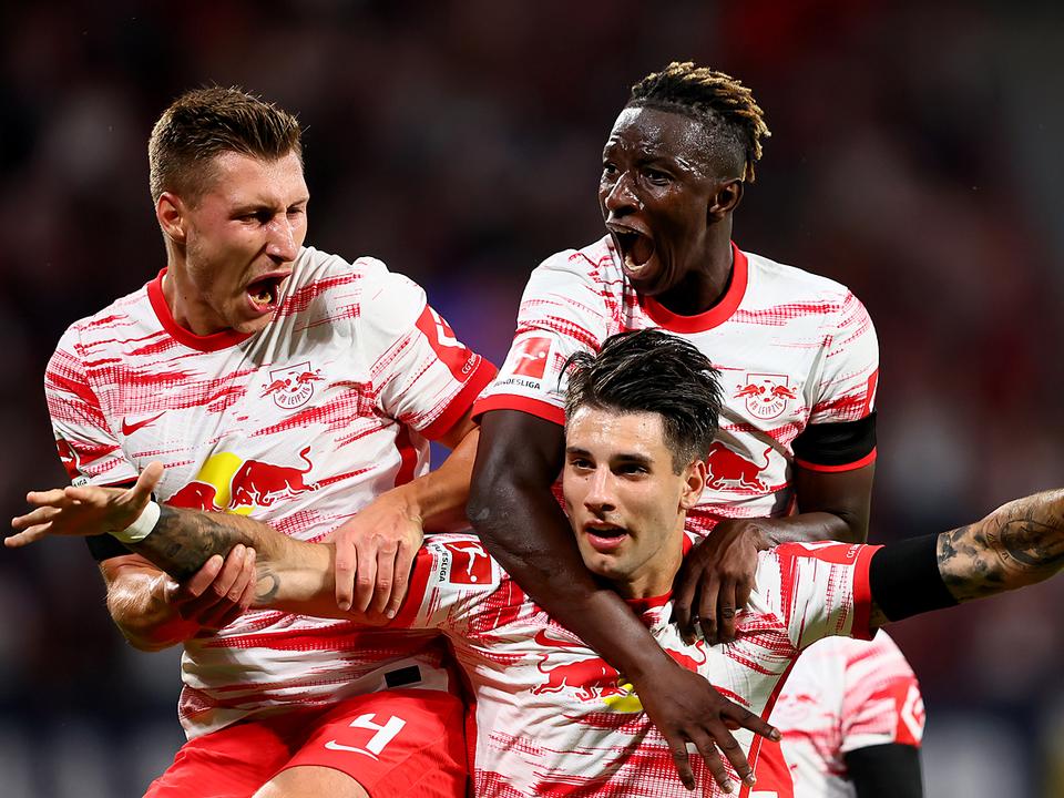 Willi Orbán és Amadou Haidara az első Bundesliga-gólját szerző Szoboszlai Dominik nyakában (Fotó: Getty Images)