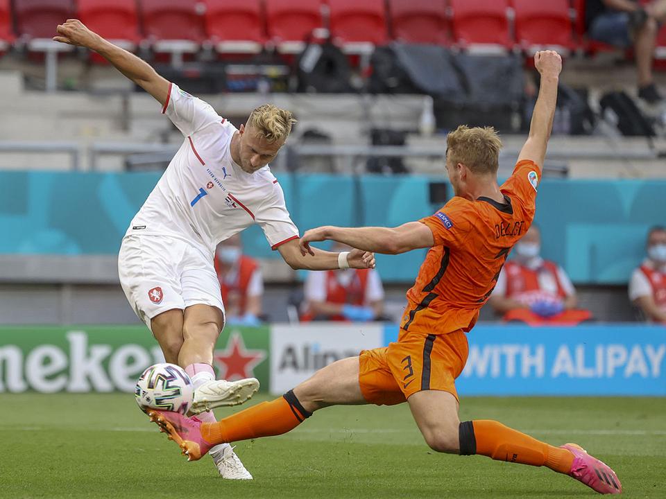 Az első húsz percben aztán a cseh kapus, Tomás Vaclík kétszer is a frászt hozta az övéire. Előbb egy szöglet utáni Matthijs De Ligt-fejesre mozdult ki rosszul: a keresztbe fejelt labdára Depay érkezett az üres kapuval szemben, de eltörte a labdát, nem is ment kapura a próbálkozása. Nem sokkal később pedig Dumfries ugrott ki a bal szélen egy indítással, már a kapus mellet is elfejelte a labdát, de a visszaérő Tomás Kalas becsúszva mentett.