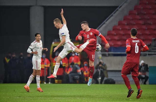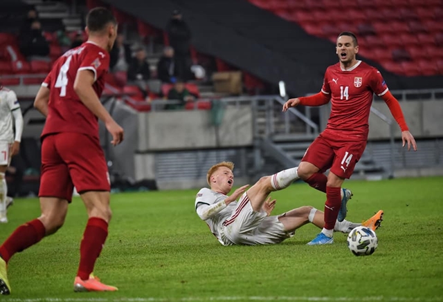 21. perc: már szinte taktikának tűnik, annyit szabálytalankodnak a szerbek a középpályán. Most 40 méterről Szoboszlai ívelhet a kapu elé. Most Lang marad le egy kicsivel.