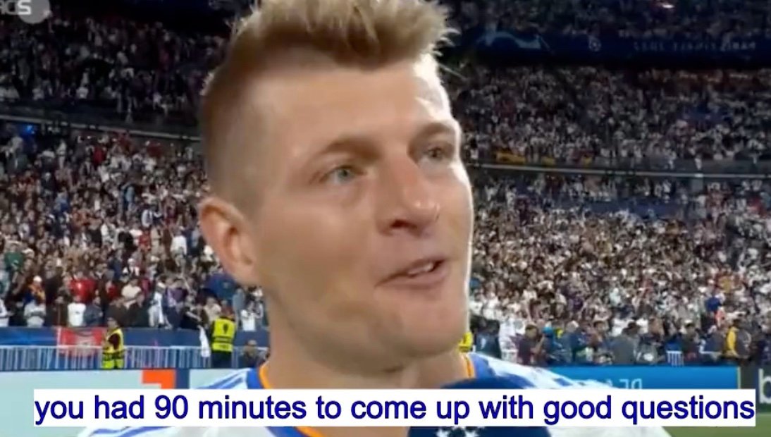 Erre Kroos teljesen kiakadt, azt mondta, „volt rá 90 perced, hogy értelmes kérdéseket találj ki, erre ilyen szarságokkal jössz”, majd hozzátette, tudták, hogy az angolok ellen nehéz lesz, de nem egy csoportmeccsen focizgattak, hanem a BL-döntőjét nyerték meg éppen. Ezután egyszerűen otthagyta a tévést.