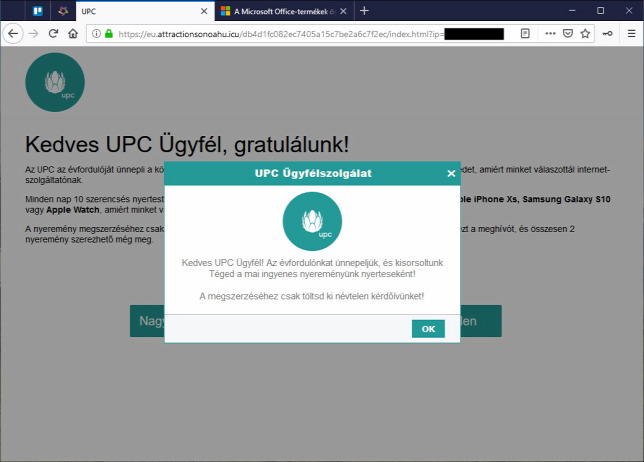 Amennyiben valakinél váratlanul betöltődik egy ilyen „nyereményes” oldal, az semmilyen információt ne adjon meg rajta. Nem tudtuk megerősíteni, de könnyen elképzelhető, hogy nem csak a UPC-t, hanem más magyar netszolgáltatót is megszemélyesítenek a csalók.