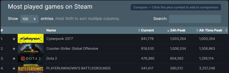 Ez a rengeteg előrendelő pedig bizony el is kezdett játszani, volt idő, hogy az 1 milliós játékosszámot is átlépték, és ez csak a Steam. A GoG, az Epic Games Store, illetve a konzolok játékosszámai ebben az 1 milliós számban nincsenek benne. A cikk írásának pillanatában is majdnem 1 millióan, pontosan 941 ezren játszanak. Csak hogy tisztábban érthető legyen mit is jelent ez a szám, a Cyberpunk 2077 előtti csúcstartó a Fallout 4 volt, ezzel 473 ezer ember játszott egyidejűleg Steamen.
