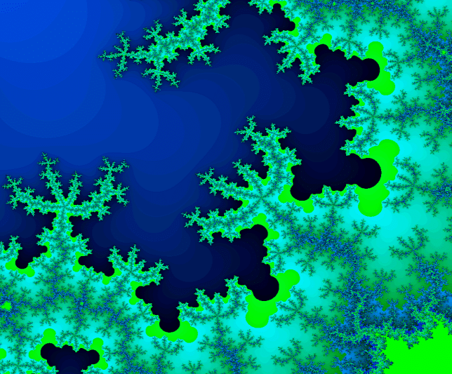 Egy Mandelbrot-halmaz, mely a káoszelmélet elemi objektuma, rajta különféle jelenségek tanulmányozhatókForrás: http://www.math.utah.edu/~alfeld/math/mandelbrot/bay.gif