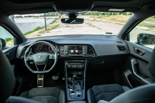 Alapáron jár az éles felbontású, könnyen leolvasható digitális műszerfal, amely négyféle módon képes mutatni a vezető számára a legfontosabb menetadatokat; van olyan téma is, ahol a fordulatszámmérő van a középpontban, és olyan is, amelyen nehéz leolvasni a sebességet és a fordulatszámot. A központi, 8 colos érintőképernyőre szintén nem lehet panasz, a VW-konszern autóitól megszokott logikus menürendszert és könnyű használhatóságot nyújtja, megspékelve néhány cuprás specialitással, mint az olajhőmérséklet, a pillanatnyi teljesítmény, vagy a kocsira ható nehézségi erők mutatása.
