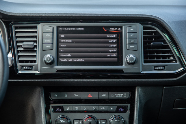 Kár, hogy a magasra szerelt sportülésnek nem csak a pozíciója, hanem a formája sem igazán sportos, csak minimális oldaltartást ad, ami passzol a SUV-jelleghez, de a cuprasághoz már kevésbé. Aki versenyautós hangulatot és jobb tartást szeretne, 530 ezer forintért rendes kagylóüléseket is vehet. Amúgy a helykínálat ugyanolyan bőséges, mint bármelyik Atecában, a 485 literes csomagtartó nem csak SUV-mércével kicsi, a kombi Leoné is több mint 100 literrel nagyobb.