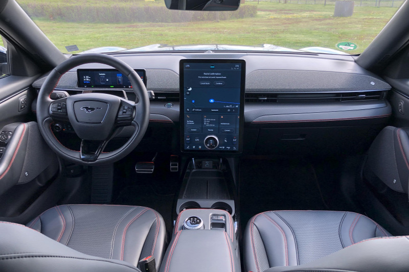 Fő riválisához hasonlóan ebbe is túlzóan nagyméretű, 15,5 colos középső képernyőt építettek be, ami látványos, de megosztó,és  szerencsére kiegészül egy vezető előtti kis kijelzősávval, ami a Teslákból hiányzik, pedig hasznos elem. A kormánykerék nekem nem annyira jött be elsőre, a rajta lévő kapcsolók (miként a fényszóró forgótárcsája is) ugyanabból a silány műanyagból készülnek, mint amiket már az előző generációs Fordokon sem szerettünk, de az összhatást megmenti a műszerfal felső részét és egyúttal az ajtóborításokban lakó hangfalak burkolatát is adó érdes tapintású szövet.