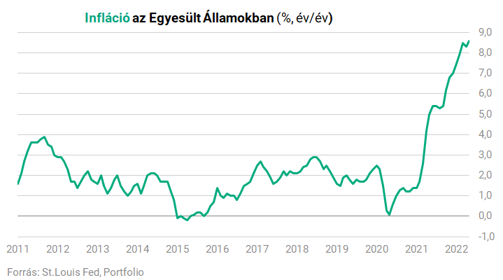 A piac ezt már pár nappal később is megkérdőjelezte, nagyon hamar újra 75 bázispontos emelés árazódott be a határidős ügyletekbe, nem sokkal később pedig maga Powell sem zárta már ki a 75 bázispontos emelés lehetőségét egy interjúban. Ennek ellenére továbbra is az 50 bázispont volt a piac várakozása, egészen múlt péntekig. A májusi inflációs adat ugyanis kellemetlen meglepetést hozott: az éves áremelkedés mértéke nőtt, a 8,6%-os infláció jócskán meghaladta a 8,3%-os előrejelzéseket. Ráadásul az elemzők arra számítottak, hogy áprilisban-májusban már megvolt a tetőzés, ehhez képest az infláció tovább nőtt. Ez a tény alaposan átírta a várakozásokat.