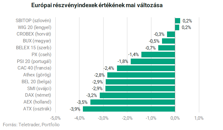 Közben az európai tőzsdéken tovább nő a nyomás, a DAX már több mint 3 százalékos mínuszban van, de a zárás felé közeledve a BUX továbbra is kitart.