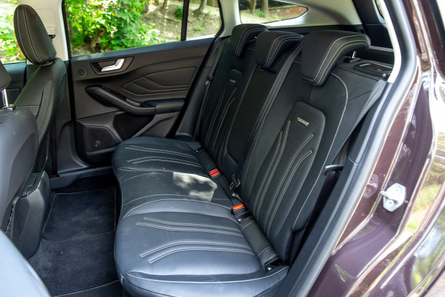 Azon, hogy – hosszirányban legalábbis – hátul felnőtteknek is tisztességesen el lehet férni, már évek óta nem kell csodálkozni az alsó-középkategóriás autóknál, s ez természetesen a 2,7 méteres tengelytávú Focusra is igaz. Inkább a fejtérrel szoktak gondok adódni, ebből a szempontból bölcs választás a csak az ülés mögött lejtő tetővonalú, tolótető nélküli kombi. De igazsághoz tartozik, hogy a magas ablakvonal, illetve Vignale tesztautónk fekete kárpitozása nem használ a térérzetnek.