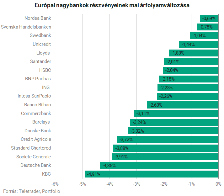 A gazdasági ciklusokra kifejezetten érzékeny bankrészvények szintén komoly esésben vannak, a KBC és a Deustche Bank részvényei esnek a legjobban.