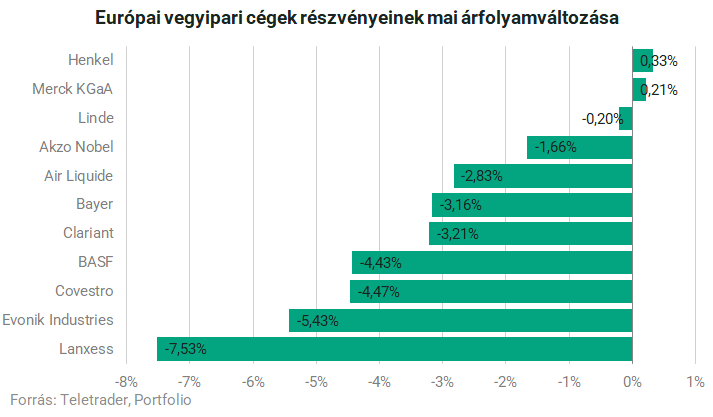 A vegyipari részvényeknél sem jobb a helyzet, az esést az Evonik és a Lanxess vezeti, egyaránt komoly, 5 százalékot meghaladó mínusszal.